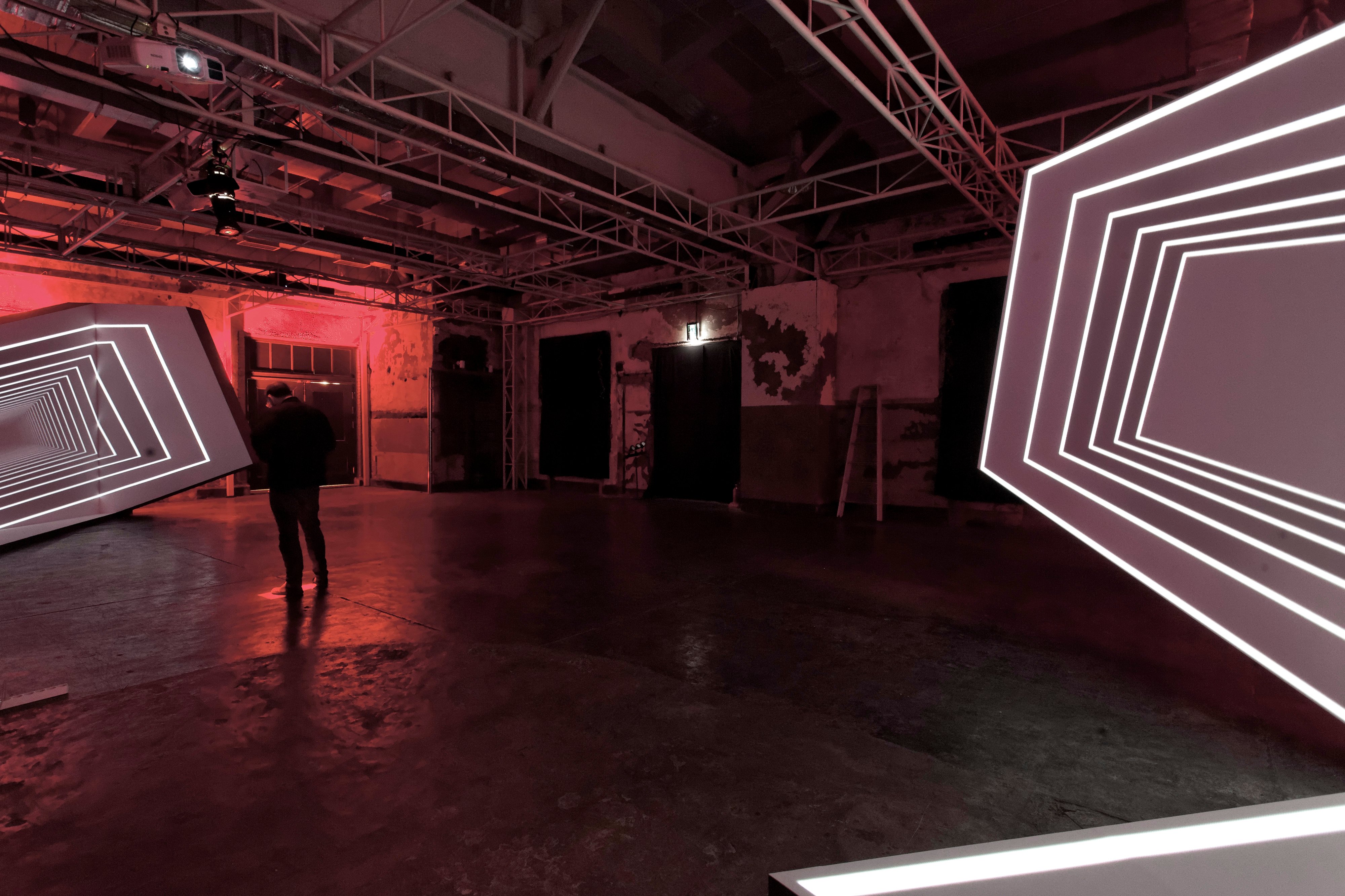 Frame Perspective is an audiovisual light installation presented in three variations: horizontal, vertical, or in situ. It consists of a series of frames placed one behind the other, each incorporating a light system.
