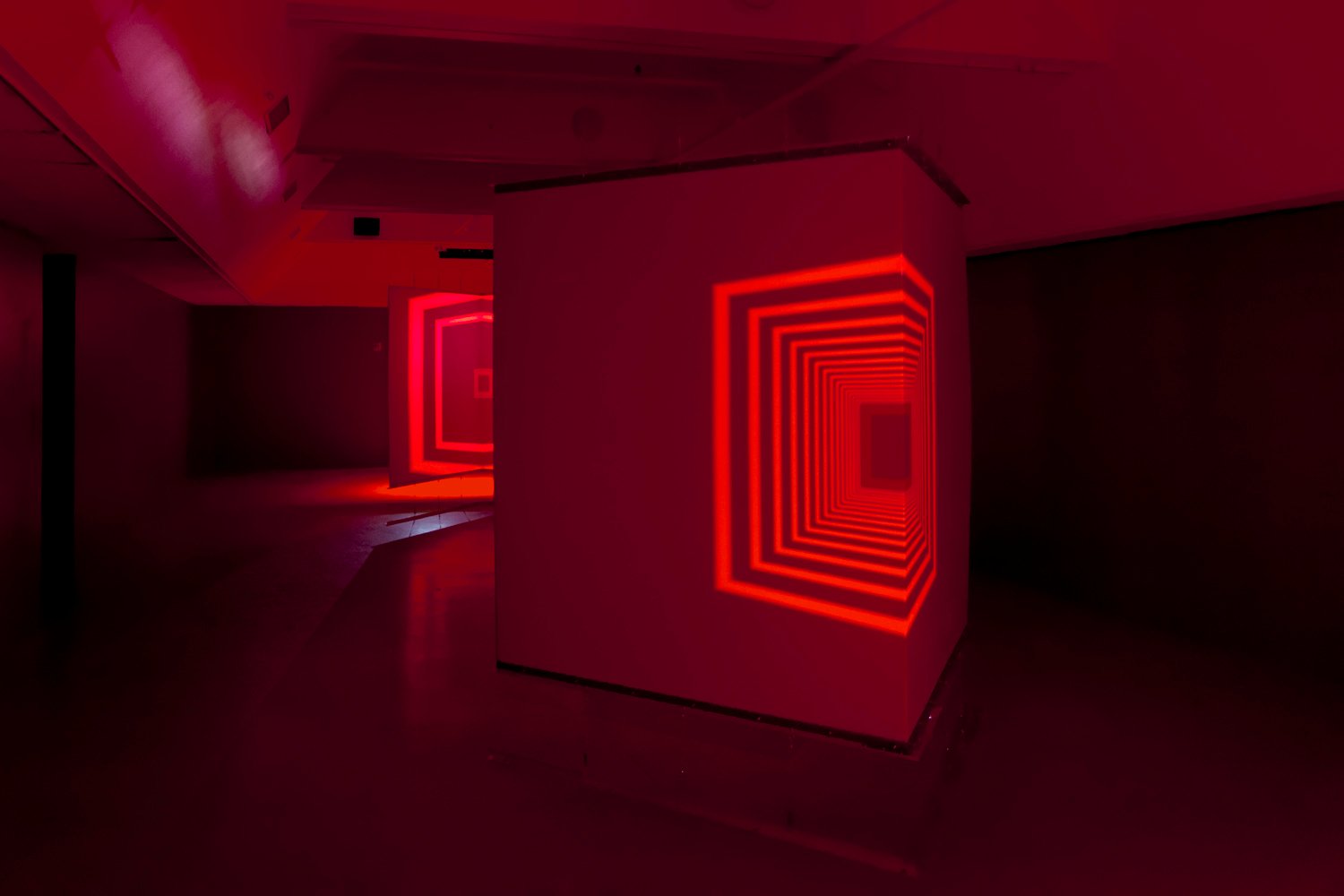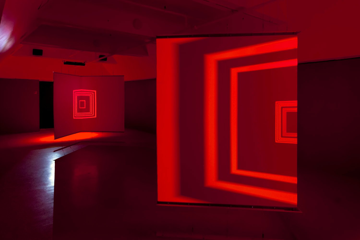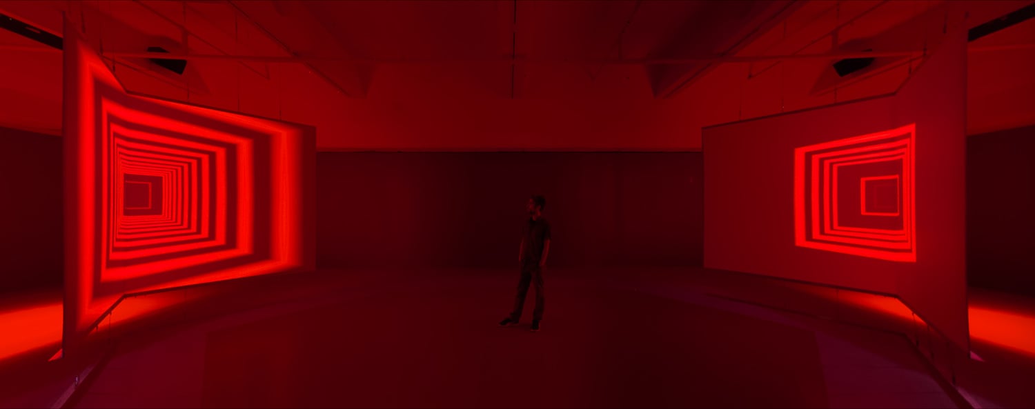 The audiovisual generative installation Pêle-Mêle uses a double anamorphosis visible from one sole and unique viewpoint. Upon entering the room, the viewer finds himself at equal distance between two transparent modules in the form of right angles, situated on either side of the space, which superimpose themselves on the existing environment.